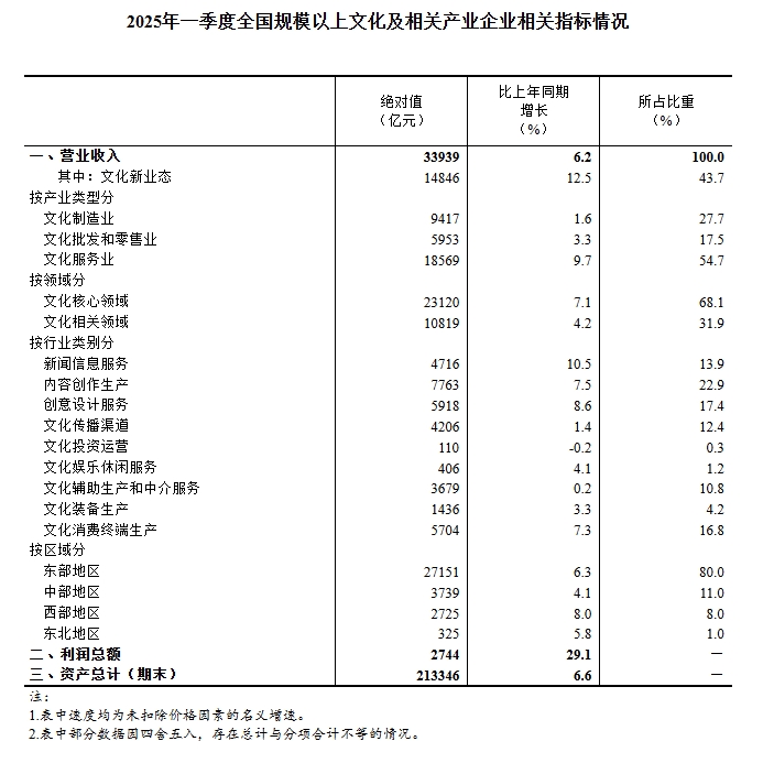 中國經(jīng)濟(jì)網(wǎng)北京4月29日訊(記者 成琪)記者從國家統(tǒng)計局獲悉,據(jù)對全國8.0萬家規(guī)模以上文化及相關(guān)產(chǎn)業(yè)企業(yè)(以下簡稱“文化企業(yè)”)調(diào)查,2025年一季度,文化企業(yè)實現(xiàn)營業(yè)收入33939億元,按可比口徑計算,比上年同期增長6.2%。其中,文化新業(yè)態(tài)特征較為明顯的16個行業(yè)小類實現(xiàn)營業(yè)收入14846億元,比上年同期增長12.5%,快于全部規(guī)模以上文化企業(yè)6.3個百分點。