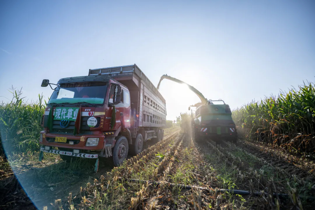 秋分前后是制作青貯的黃金期,現(xiàn)代牧業(yè)烏蘭布和一牧收割的全株玉米,淀粉含量達(dá)33%、水分控制在67%。田野間,收割機(jī)呈“品”字形推進(jìn),切割、粉碎一氣呵成,蠟熟期的玉米連同植株被切割成2公分左右的飼草顆粒,通過(guò)傳送帶涌入隨行的運(yùn)輸卡車。