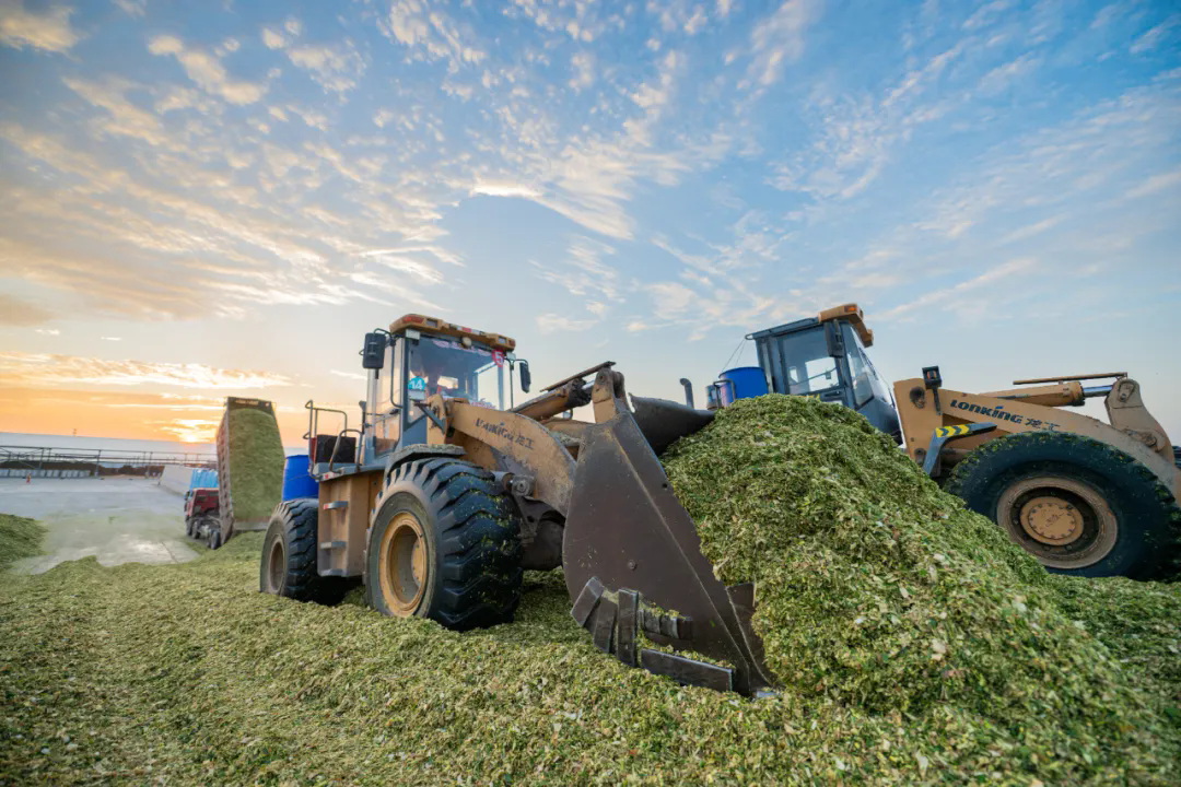 車斗在轟鳴聲中緩緩升起,豐收的青貯順著傾斜的車廂傾瀉而下,在窖池邊緣堆起蓬松的草垛。